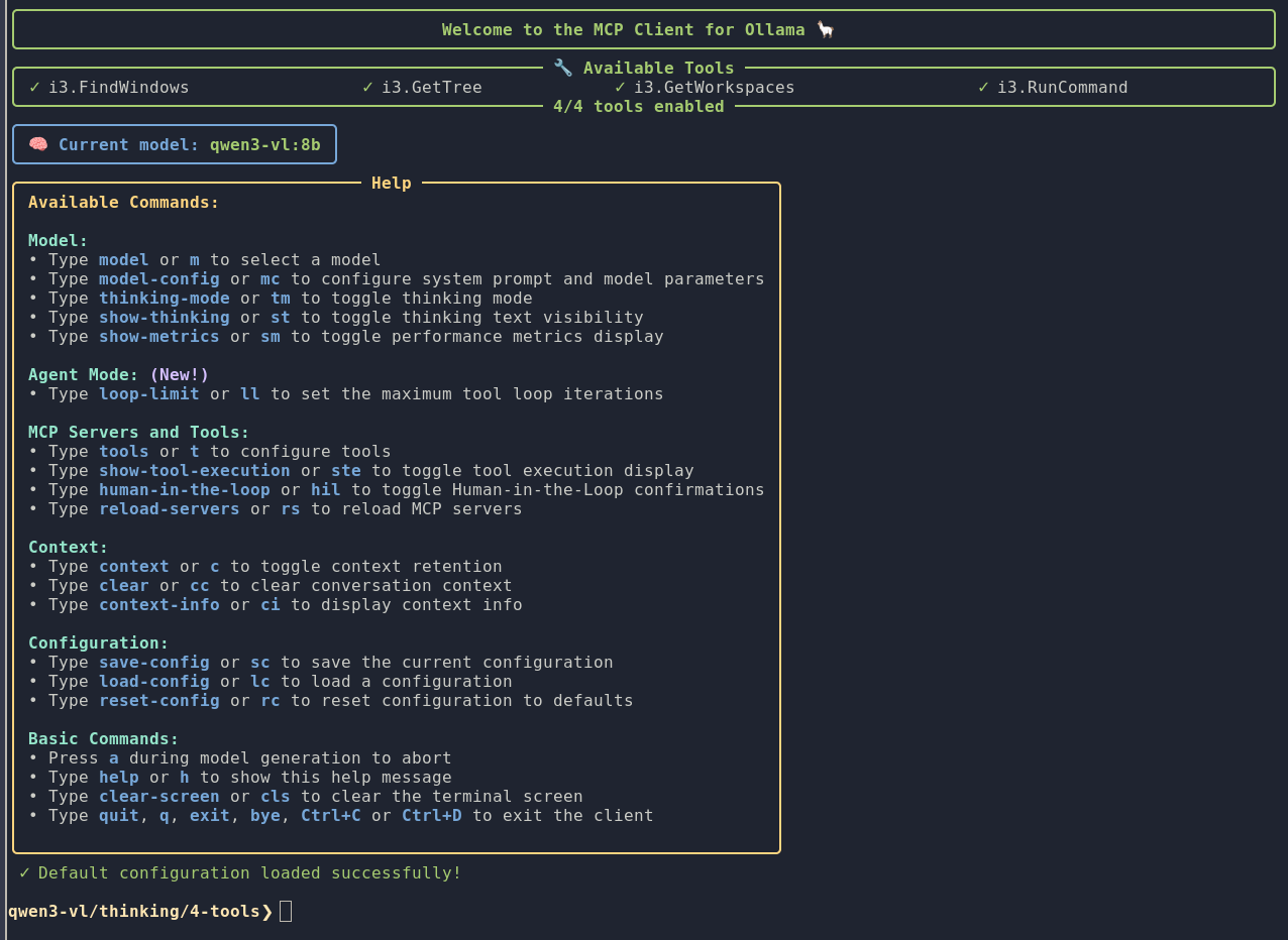 Building ithreemcp was just the first step in my learning process. MCP has features I glossed over — Prompts, Resources, Sampling, Elicitation. I never really understood why Prompts existed in MCP. But watching qwen3-vl:8b stumble on i3 syntax occasionally, I get it now: an MCP server can ship prompts that teach clients how to use its tools effectively. I look forward to exploring these topics further.