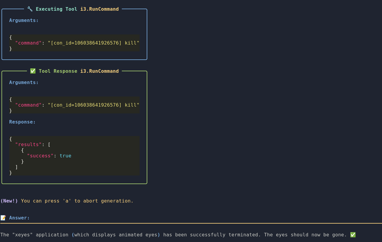 In fairness, sometimes it gets the i3 run command syntax wrong, and at least once it killed the xterm from which I launched xeyes (not like I had any other important tabs open or anything). But this was just some initial research. I think with a proper system prompt, and some i3 syntax examples it would perform well.